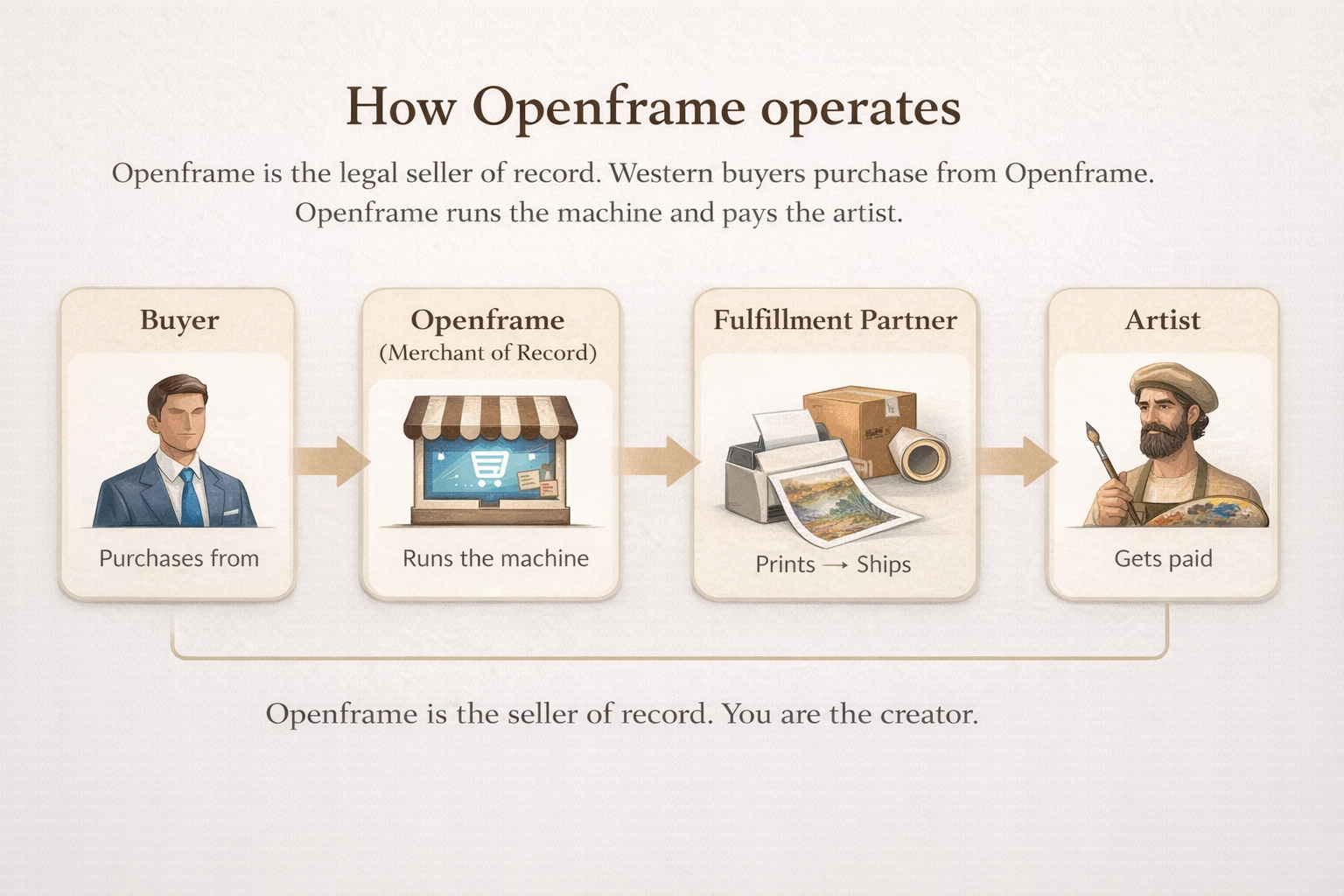 Openframe is the legal Merchant of Record for every sale. Western buyers purchase from Openframe. Openframe processes payment, manages taxes and compliance, handles customer service, and coordinates fulfillment. Openframe then pays the artist their share on a regular schedule.