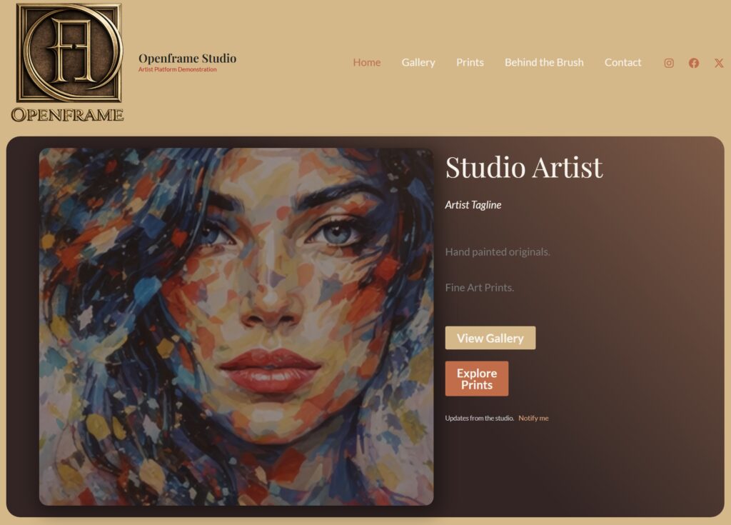 كل فنان يتم قبوله يحصل على حضور رقمي كامل موجّه للأسواق الغربية، ويتم بناؤه وإدارته بواسطة Openframe.
